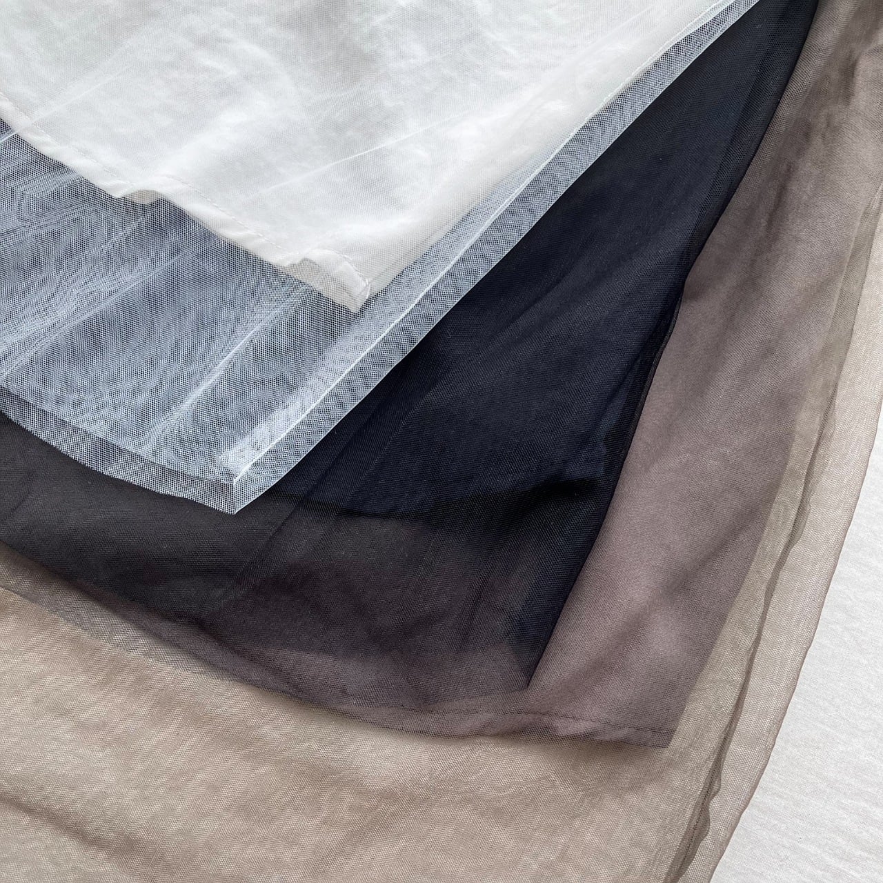 袖と身頃全体にチュールを重ねた、レイヤードブラウスです。 フレア袖はあまり分量を入れず、可愛くなりすぎないようなデザインに。 オトナかわいい印象に仕上げました。 落ち感があり柔らかく、普段使いしやすい素材を使用。 シワになりにくいのも◎ エアフロー加工という特殊な染め方をすることで、生地表面にビンテージライクな凹凸感をプラスしています。 さらっとしたタッチで、汗をかいても乾きやすいので暑い時期におすすめの素材です。 ※エアフロ―加工とは…生地の染色の際に、熱風をいれて機械を回すことで生地全体が膨らみ、柔らかく自然なオウトツ感のある生地へと仕上げています。 モデル身長:155㎝ 素材 チュール側:ナイロン100% 布帛側:ポリエステル100%