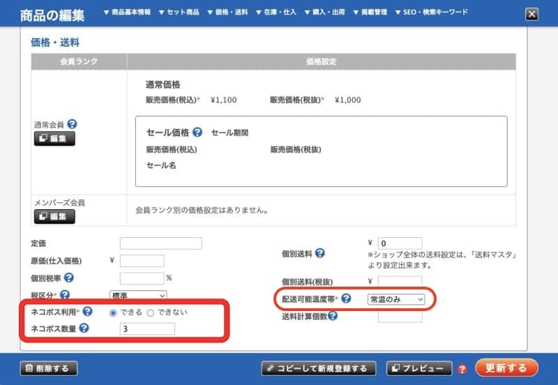 ※ネコポス利用可の場合、配送可能温度帯には常温を含む必要があります。