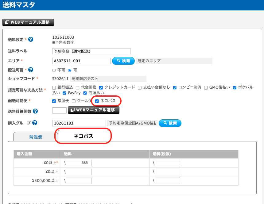 ② 送料マスタにてネコポス用の送料を設定してください