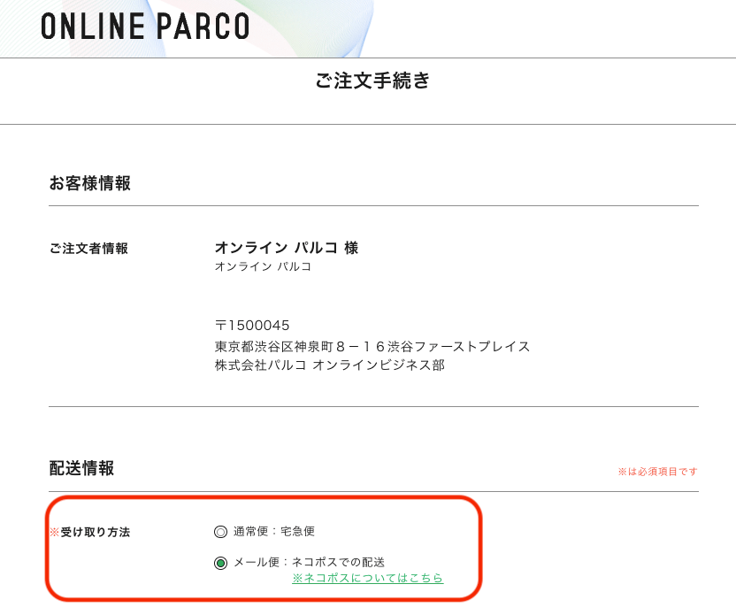 ・ネコポス利用できる商品の場合、注文画面で受け取り方法が選択できます。